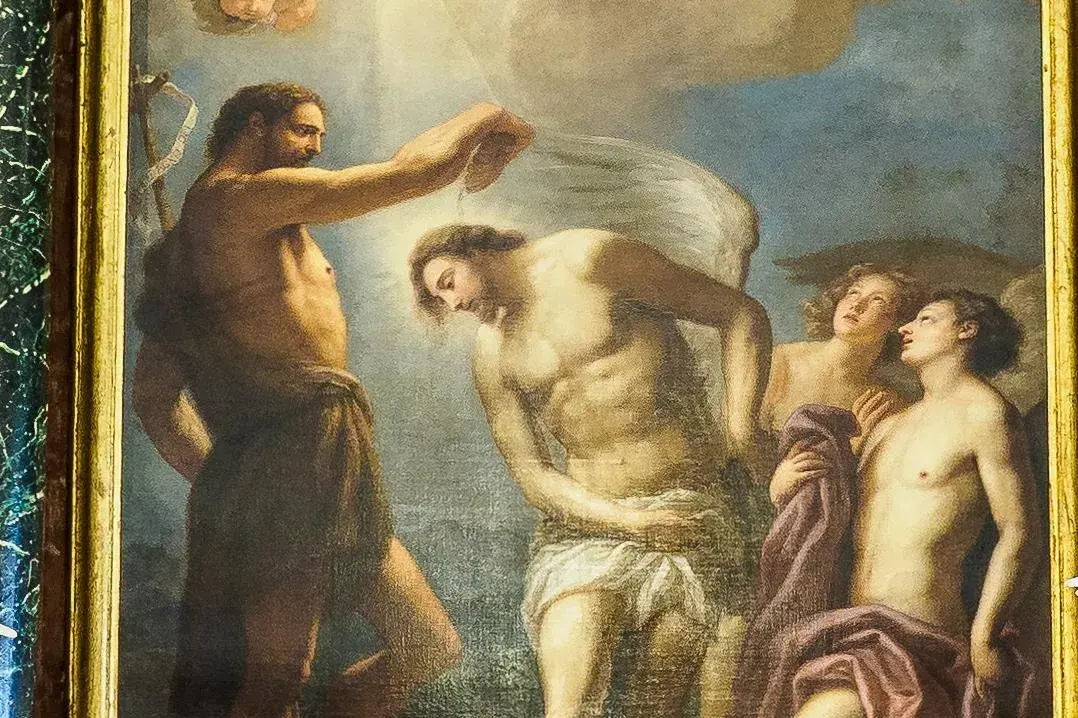Den Mittelpunkt der Taufszene bildet Jesus. Er steht, mit einem Lendenschurz bekleidet, im Fluss Jordan. Am linken Ufer befindet sich Johannes der Täufer, der den Gottessohn mit Wasser aus einer Muschel tauft. Zwei Engel bestaunen das heilige Geschehen. Über der Szene schwebt Gott, begleitet von einer Schar Putti. Die weiße Taube am Himmel – das Symbol des Heiligen Geistes – erhellt die Taufe mit einem warmen Licht. Gott der Vater, Jesus Christus und der Heilige Geist verweisen auf die Dreifaltigkeitslehre.